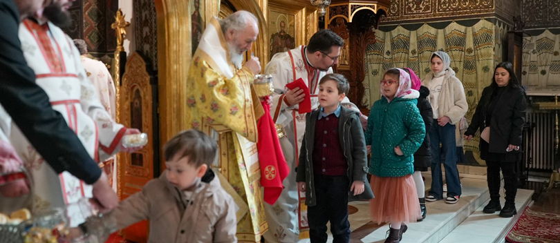 La momentul cuvenit din cadrul Sfintei Liturghii, mai mulți copii prezenți la slujbă au fost împărtășiți cu Sfintele Taine.