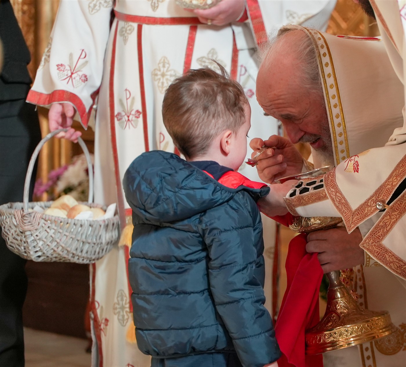 La momentul cuvenit, mai mulți copii prezenți la slujbă au fost împărtășiți cu Sfintele Taine.