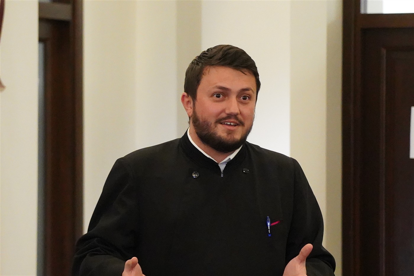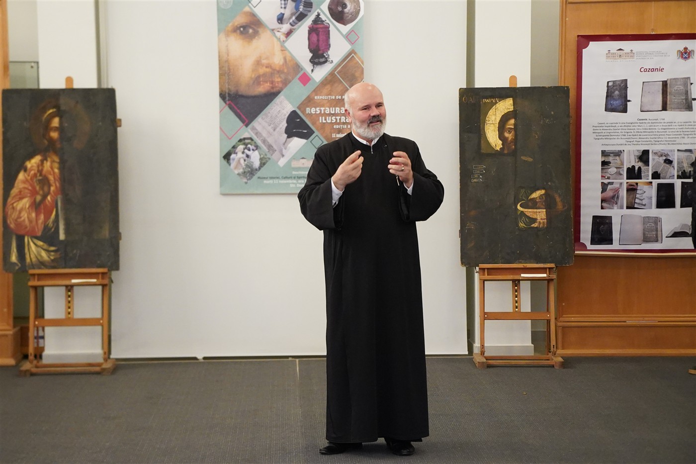Ierarhul locului nu a putut fi prezent la eveniment, întrucât s-a aflat în localitatea Târlele Filiu, judeţul Brăila, la conferinţa de toamnă, însă a intrat în legătură telefonică cu cei prezenţi la eveniment, transmiţîndu-le un cuvânt de binecuvântare şi apreciere pentru implicarea în astfel de manifestări culturale care comunică vizual frumosul şi lumina din creaţia lui Dumnezeu prin priceperea, darul şi efortul artistului şi al restauratorului către sufletele celorlalţi semeni.