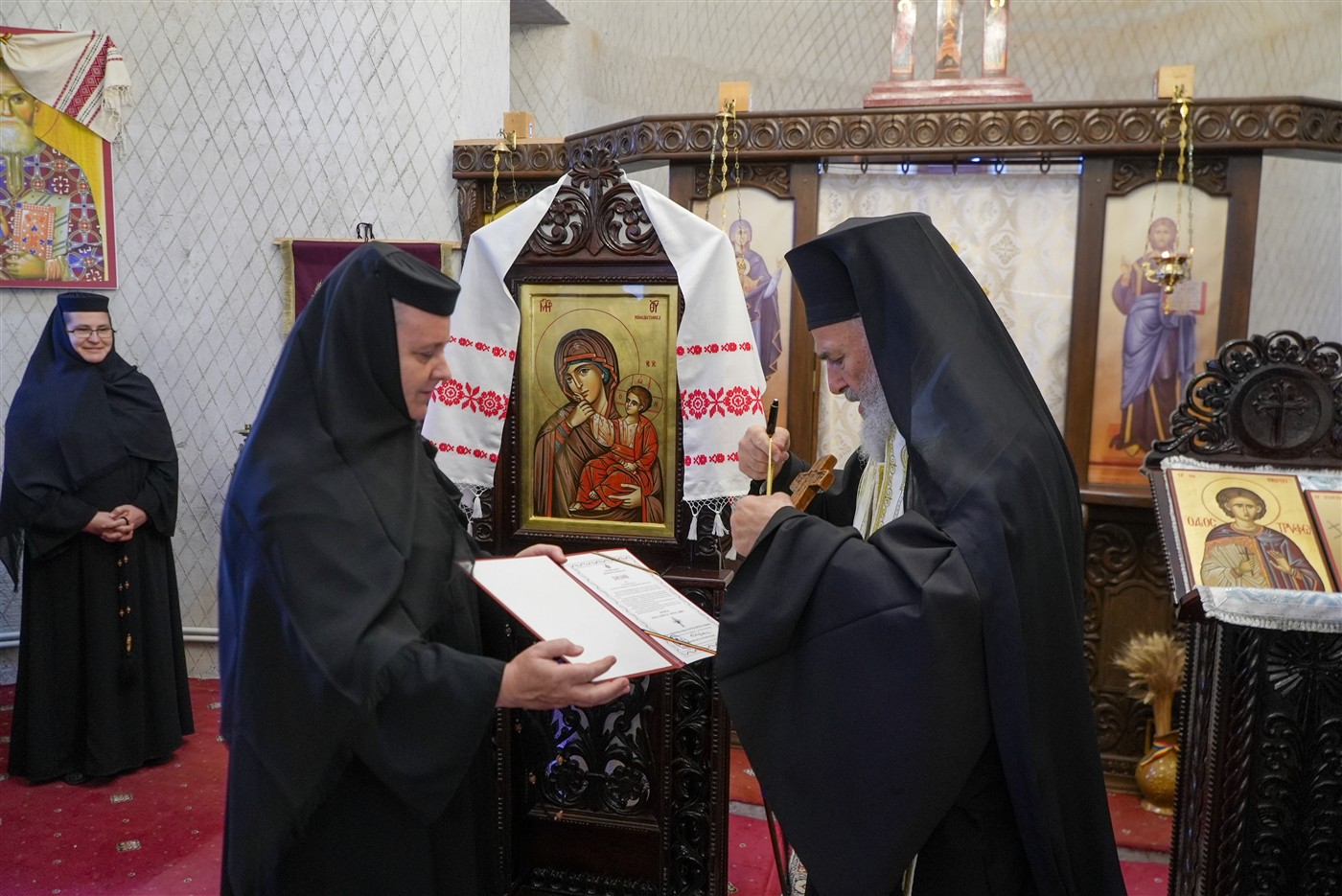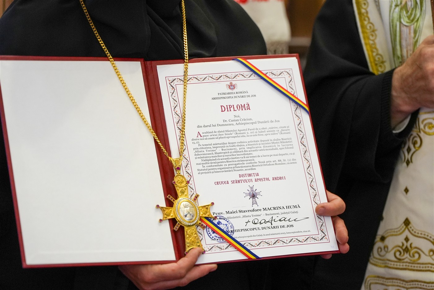 În cadrul acestor momente de rugăciune şi de binecuvântare, chiriarhul Dunării de Jos a oferit distincţia eparhială ”Crucea Sfântului Apostol Andrei” la trei dintre stareţele de la mănăstirile eparhiei care au oferit un sprijin financiar deosebit pentru lucrările de la Catedrala Mântuirii Neamului.