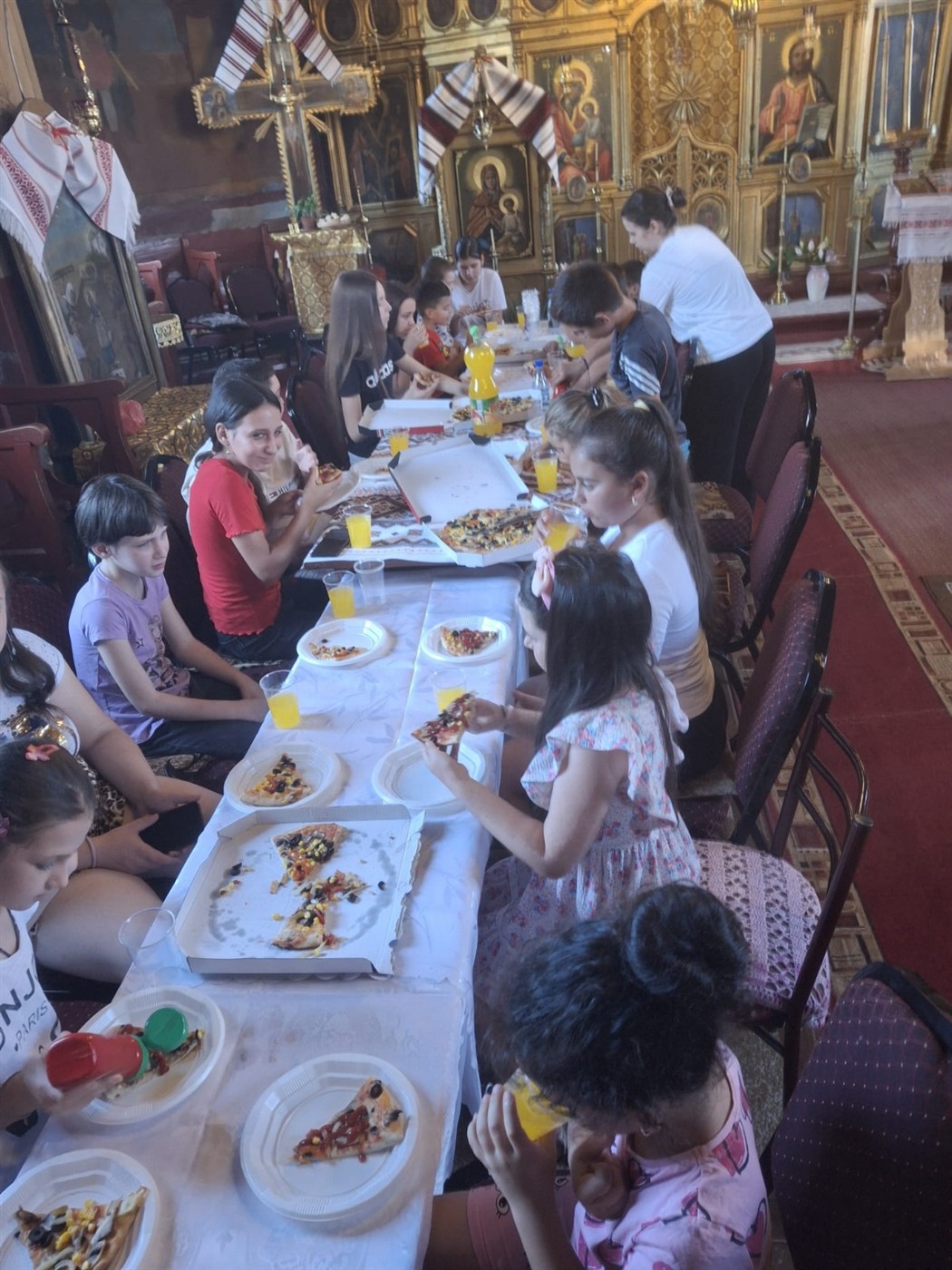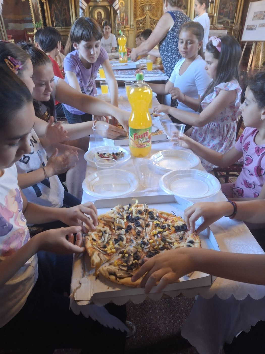 La ora prânzului, copiii au primit din partea credincioșilor pizza de post, gogoși și suc.
