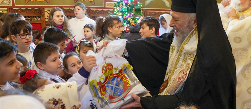 După slujbă, copiii au cântat colinde şi apoi au primit iconiţe, cărţi de rugăciune, dulciuri, fructe şi alte daruri din partea Părintelui Arhiepiscop Casian.